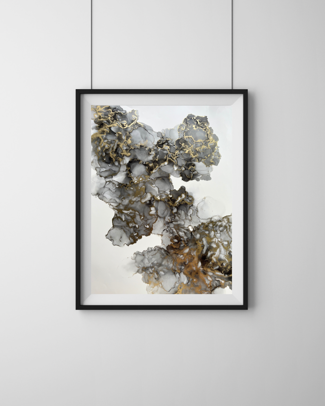 Dieses außergewöhnliche Kunstwerk strahlt eine faszinierende Ruhe aus. Die Kombination aus sanften Grautönen und leuchtenden goldenen Akzenten, geschaffen durch die Alcohol-Ink-Technik, verleiht dem Bild eine mystische Tiefe. Die feinen Strukturen und organischen Formen wirken wie eine stille Erzählung von Eleganz und Zeitlosigkeit.